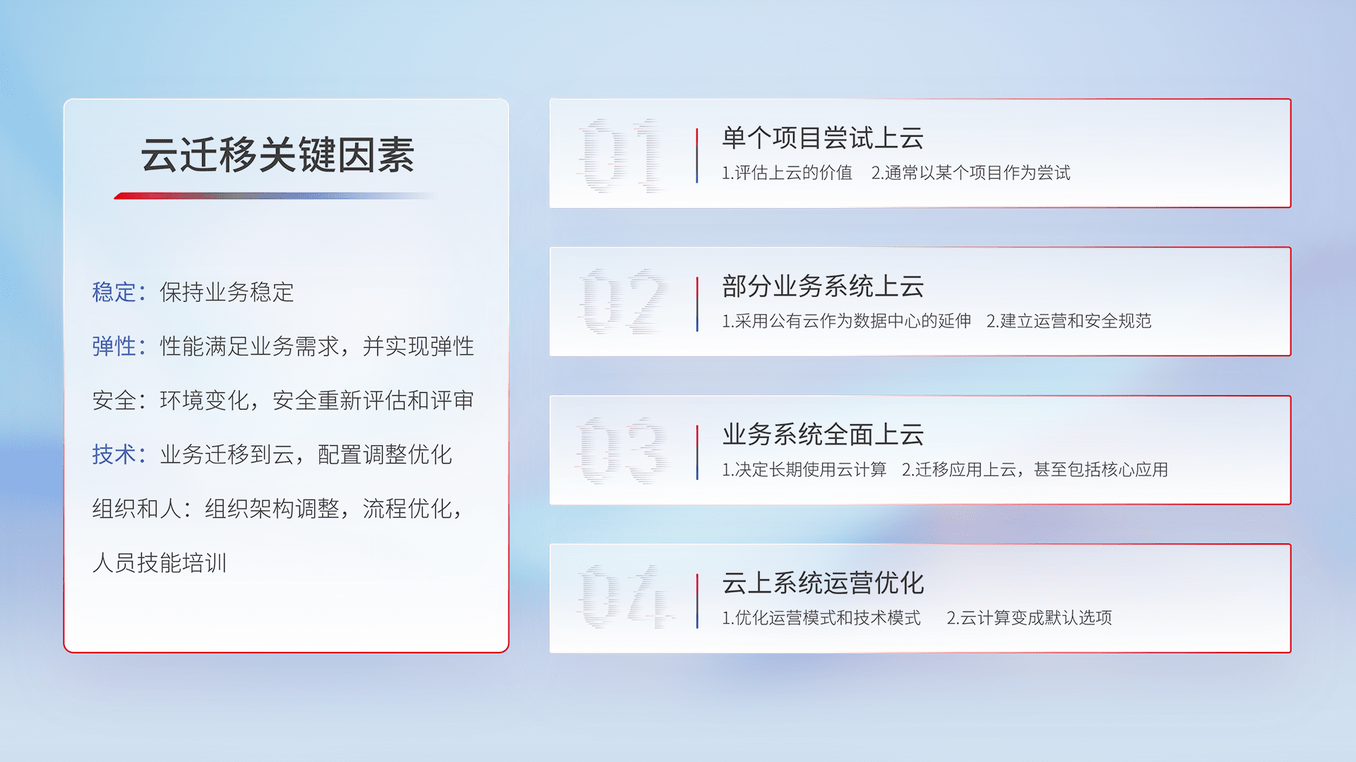 结合实际业务,,,,从规划设计、、云平台选型、、、、云原生改造、、数据迁移、、、、集成交付,,,迁移全过程为客户识别最佳上云路径,,,,做好风险识别管理,,,设计网络架构、、、、身份权限、、安全审计合规、、操作审计、、、日志审计、、、监控告警策略、、多站点容灾设计等,,,,对云上基础设施进行整体规划,,,,提升IT治理水平,,,以满足弹性、、高可用、、高性能的需求。。