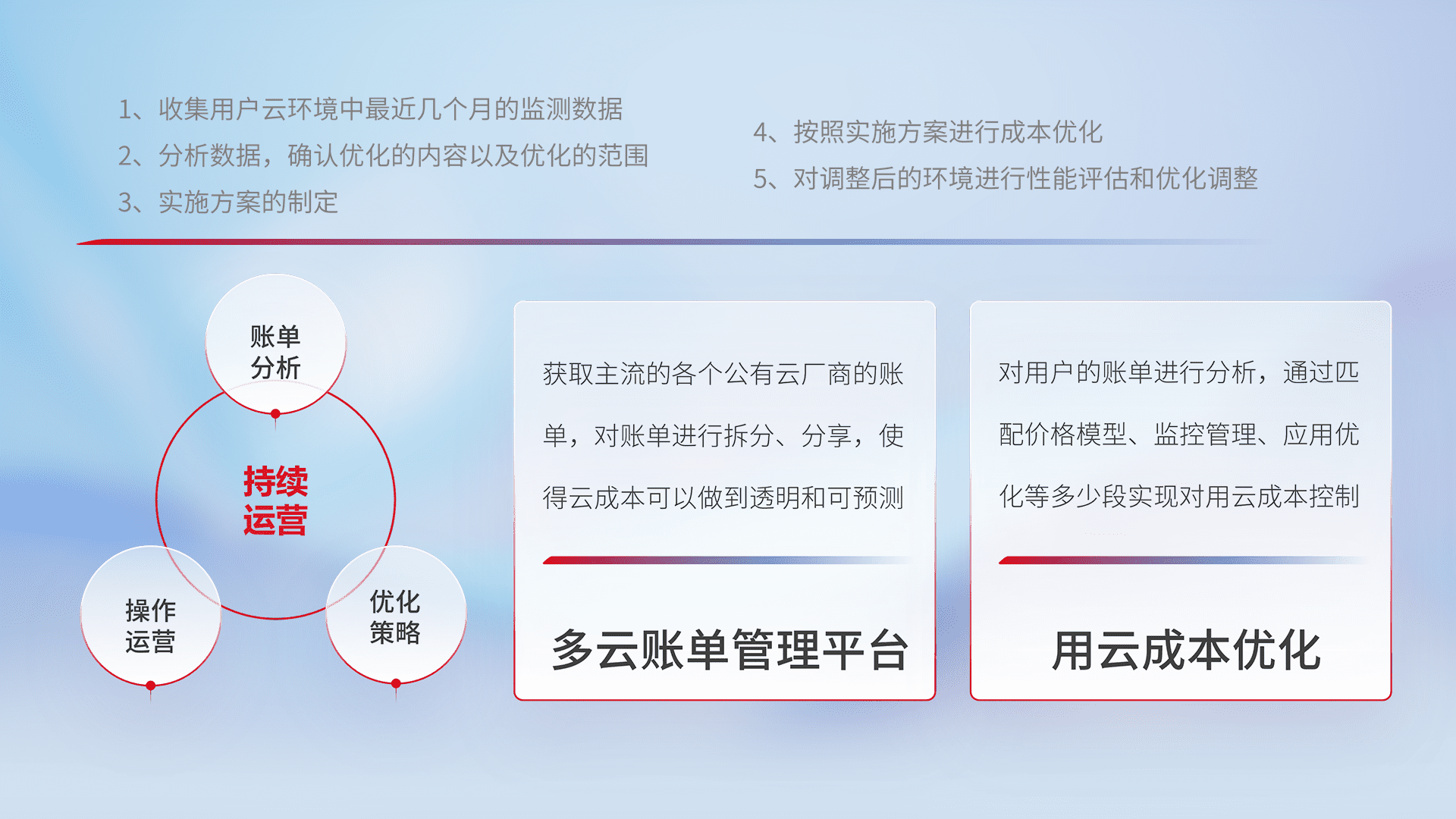 通过多云纳管,,,,以统一的资源数据模型把客户的云资源进行抽象和封装,,,进而实现对多云资源的统一操作,,保障云资源管理的可靠性、、、稳定性与可用性。。。。量身定制化运维内容,,,,配置、、、、开发运维、、、补丁管理、、、、备份、、、、监控、、认证和访问管理、、、、审计和日常巡检等,,,保障在用云过程中的可靠度,,,稳定度以及高可用率。。。。